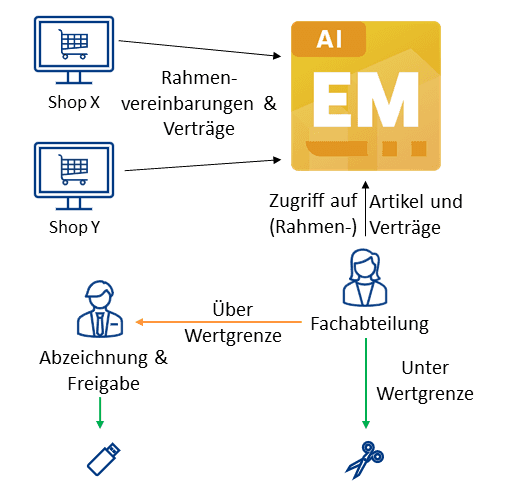 Unser bezuschlagter Beispiel-Bieter hat uns mittlerweile den Katalog zur Verfügung gestellt, den wir einfach in den AI EINKAUFSMANAGER einbinden können. Die abrufberechtigten Fachabteilungen können nun auf die vereinbarten Kontingente des Rahmenvertrags zugreifen. Der Abrufprozess kann hier von den Abteilungen individuell konfiguriert und festgelegt werden. Jede Abteilung hat die Möglichkeit ihre eigenen Wertgrenzen einzustellen, bis zu denen eine Bestellung ohne weitere Genehmigung getätigt werden darf. Über der festgelegten Wertgrenze können eigene Freigabeprozesse mit Abzeichnungsvorgängen beliebig vieler Instanzen definiert werden.