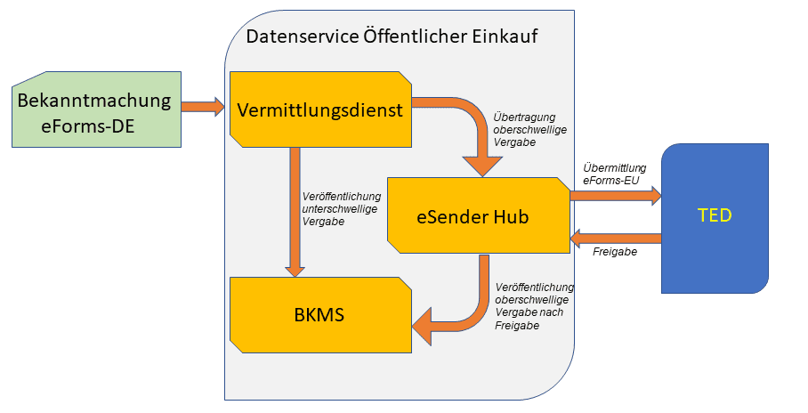 Der Datenservice Öffentlicher Einkauf wird vom Bund bereitgestellt. Er dient der Umsetzung des Onlinezugangsgesetzes (OZG) und soll den Zugang zu öffentlichen Ausschreibungen erleichtern. Der Datenservice Öffentlicher Einkauf besteht aus drei Komponenten: dem nationalen Bekanntmachungsservice, einem Vermittlerdienst und der sogenannten eSender Hub. Diese Dienste regeln sowohl die nationale Veröffentlichung von Bekanntmachungen als auch die formgerechte Kommunikation mit dem Tender Electronics Daily (TED), der Plattform der EU.