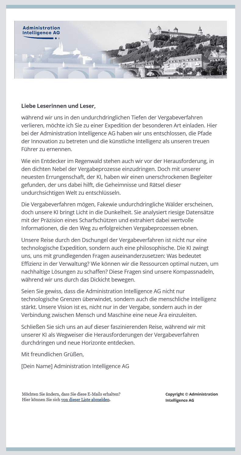 „Schreibe einen Newsletter zum Einsatz von KI bei der Administration Intelligence AG in Vergabeverfahren im Stil von Werner Herzog.“
