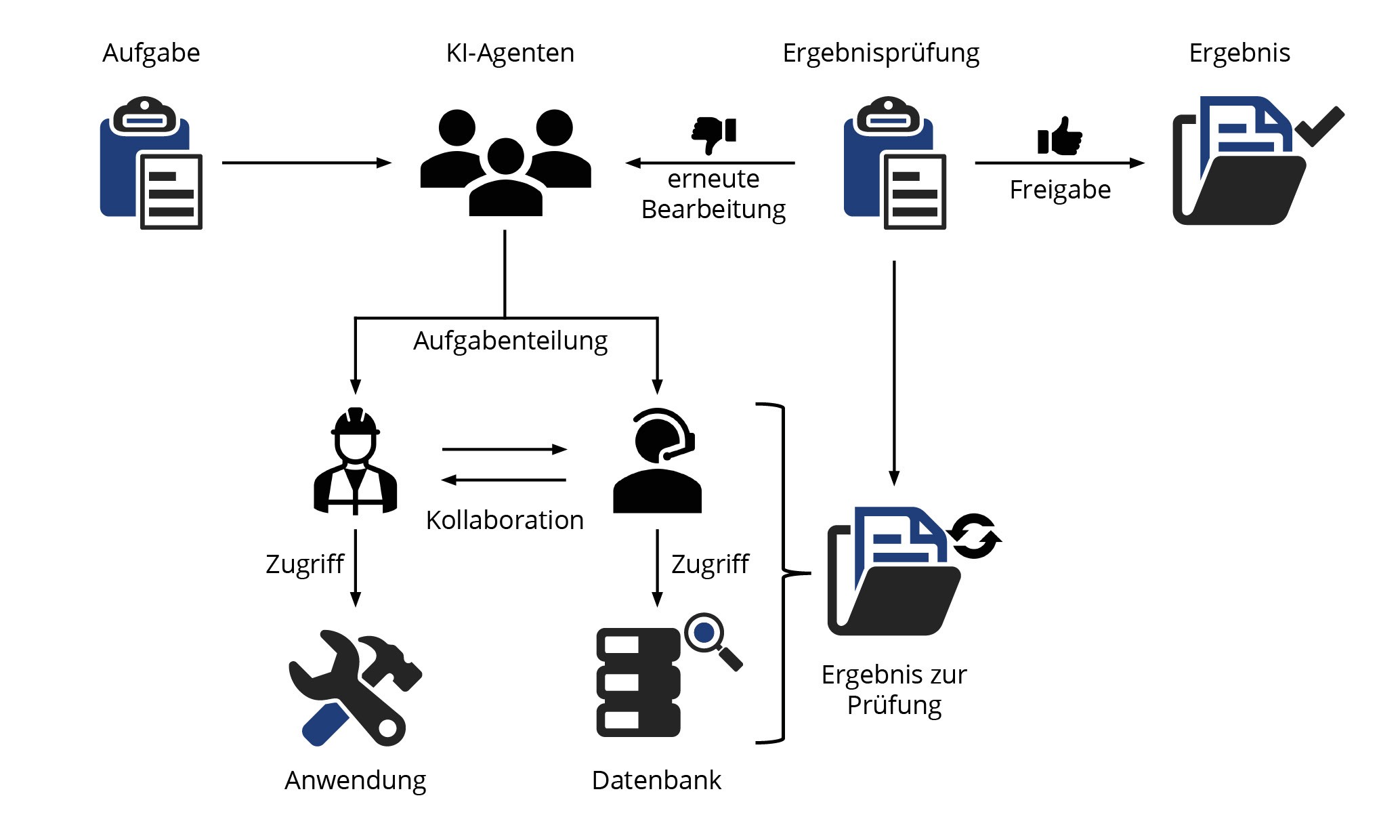 In dem hier illustrierten Beispielworkflow gibt der Nutzer eine Aufgabe an die KI-Agenten. Die Aufgabenstellung wird evaluiert und in Teilaufgaben mit entsprechenden Ergebnissen gegliedert. Diese werden anschließend an die einzelnen Agenten verteilt. Diese Arbeiten per MCP-Zugriff mit ihren Programmen oder Diensten an der Bewältigung der Aufgabe und tauschen sich für die Zusammenstellung des Ergebnisses aus. Ein vorläufiges Ergebnis wird dann zur Prüfung vorgelegt. Nun bewertet eine Instanz das Ergebnis in Relation zur ursprünglichen Aufgabe und entscheidet, ob diese erfüllt wurde. Trifft dies nicht zu, wird die Aufgabe erneut an die Agenten mit Anpassungen zur Überarbeitung gegeben. Ist die Aufgabe erfüllt, wird das Ergebnis dem Nutzer zur eigenen Prüfung vorgelegt.
