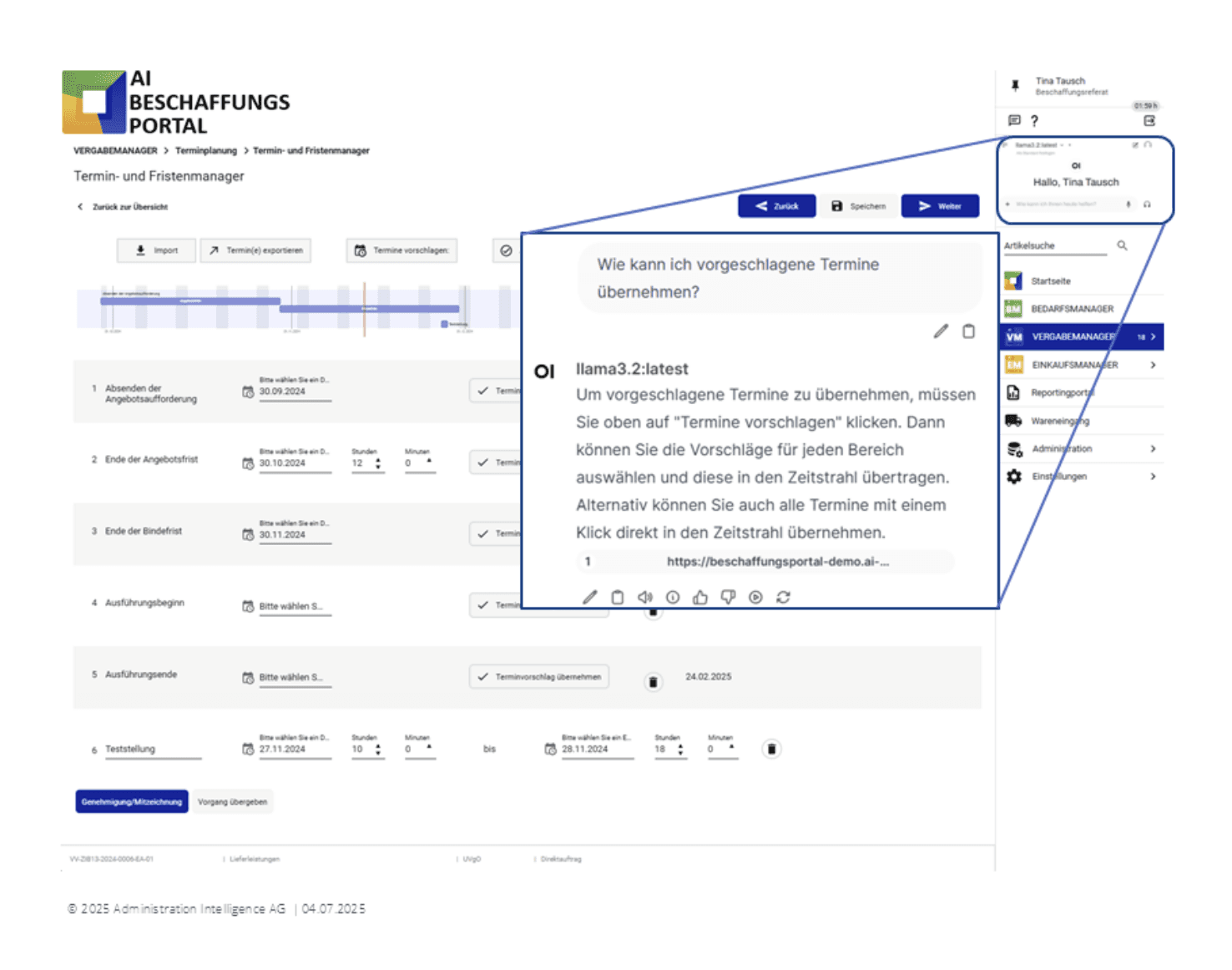 Wir beraten Sie gerne in all Ihren Fragen rund um KI und deren Einsatz. Wir analysieren Ihre Bedürfnisse und Datenschutzanforderungen und erstellen darauf mit Ihnen zusammen die passende Variante der KI-Integration in Ihr AI BESCHAFFUNGSPORTAL. Auch beim Thema Hosting eines eigenen Modells unterstützen wir Sie gerne bei der Bereitstellung.