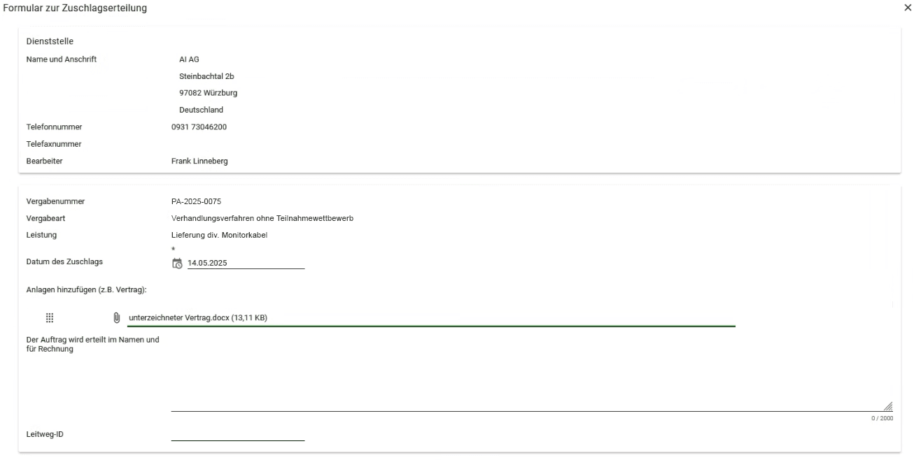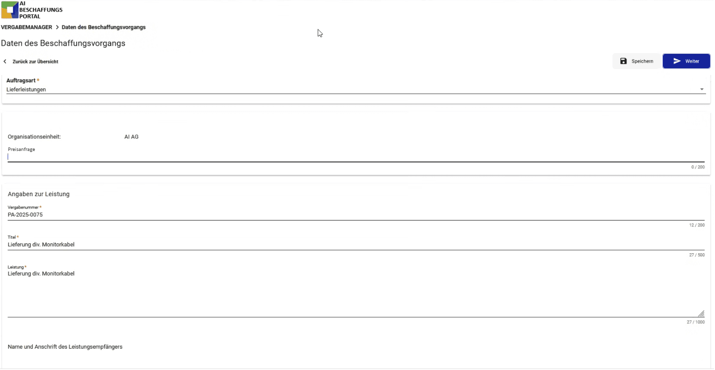 Mit wenigen Pflichtfeldern wie Titel, Vergabenummer, Leistung und Fristen ist die Vergabe schnell angelegt.