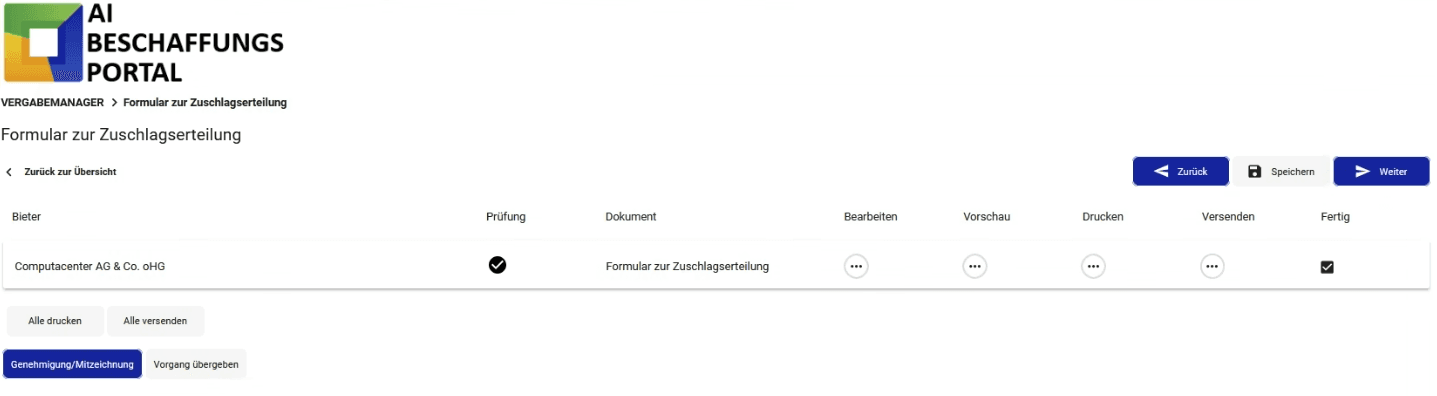 In einer anschaulichen Übersicht kann aus allen Angeboten, das Angebot für den Zuschlag mit einem Klick ausgewählt werden. Die Erstellung und der Versand der nachfolgenden Zu- und Absageschreiben funktionieren automatisch. Auf Wunsch können diese jedoch auch vor dem Versand angepasst werden.