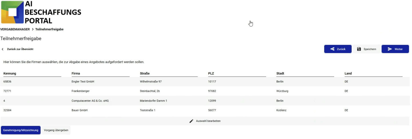 Unternehmen können bequem aus dem System ausgewählt werden und zur Angebotsabgabe eingeladen werden.