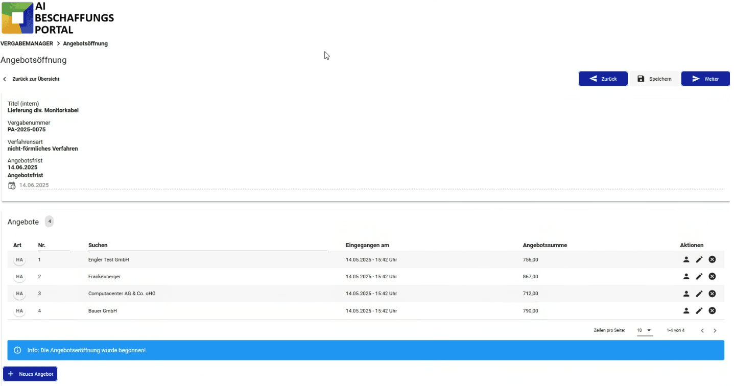 Wie gewohnt, werden in diesem Schritt die eingegangenen elektronischen Angebote geöffnet.