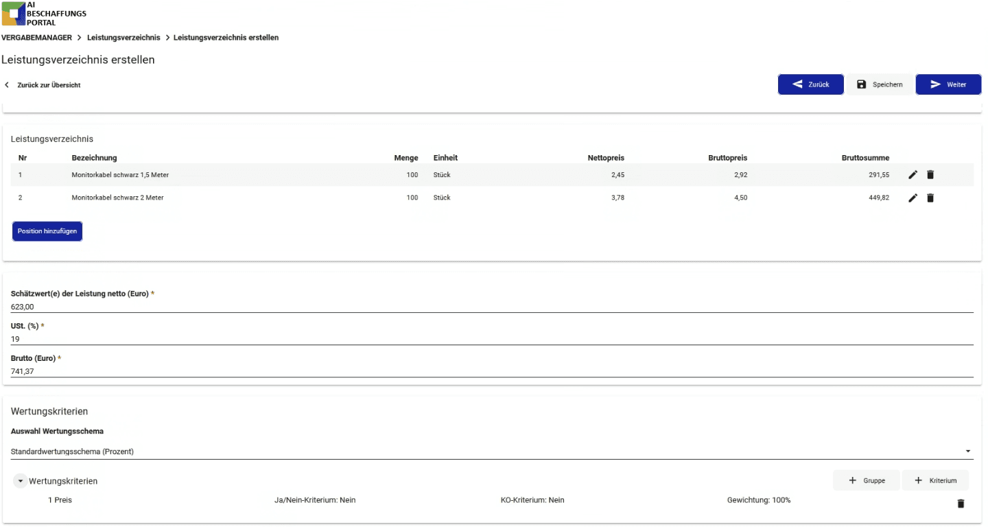 Ob Bau-, Liefer- oder Dienstleistungen – Positionen lassen sich unkompliziert erfassen. Der Preis ist Standardwertungskriterium, weitere Kriterien (z. B. Nachhaltigkeit) können optional ergänzt und gewichtet werden.