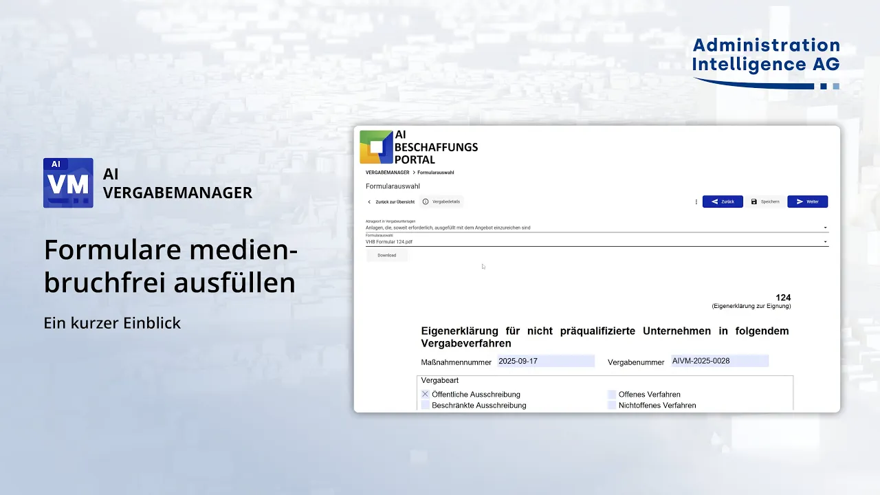 Ein Beispiel: Standardformularsätze für Bauleistungen. Früher wurden die PDF-Formulare noch über verschiedene Eingabemasken befüllt. Im Modul AI VERGABEMANAGER können die PDF-Formulare nun direkt befüllt werden und sind automatisch Teil der Vergabeunterlagen.