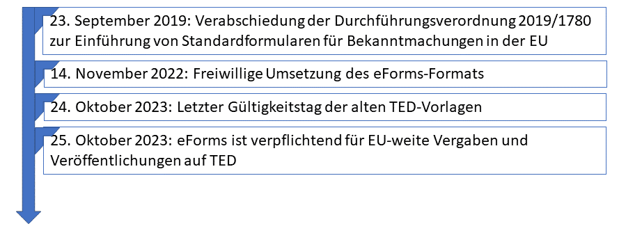 Bereits seit November 2022 können eForms auf freiwilliger Basis genutzt werden. Bis 24. Oktober 2023 ist noch eine Veröffentlichung mit dem alten Formularsatz möglich. Ab dem 25. Oktober ist dann das neue eForms-Format verpflichtend für alle EU-weiten Bekanntmachungen von Vergabeverfahren. Die Basis für diese Umstellung bildet die Durchsetzungsverordnung (EU) 2019/1780 (https://eur-lex.europa.eu/legal-content/de/TXT/?uri=CELEX%3A32019R1780).
