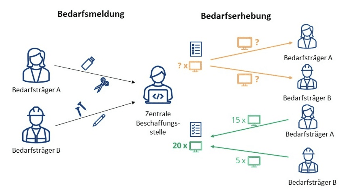 Ergebnisse aus ein oder mehreren Bedarfserhebungen können dann durch die zentrale Beschaffungsstelle, auch kollaborativ in einem Beschaffungsteam, gebündelt, aufgeteilt oder noch nachqualifiziert werden und dann in ein oder mehrere Vergabeverfahren überführt werden.